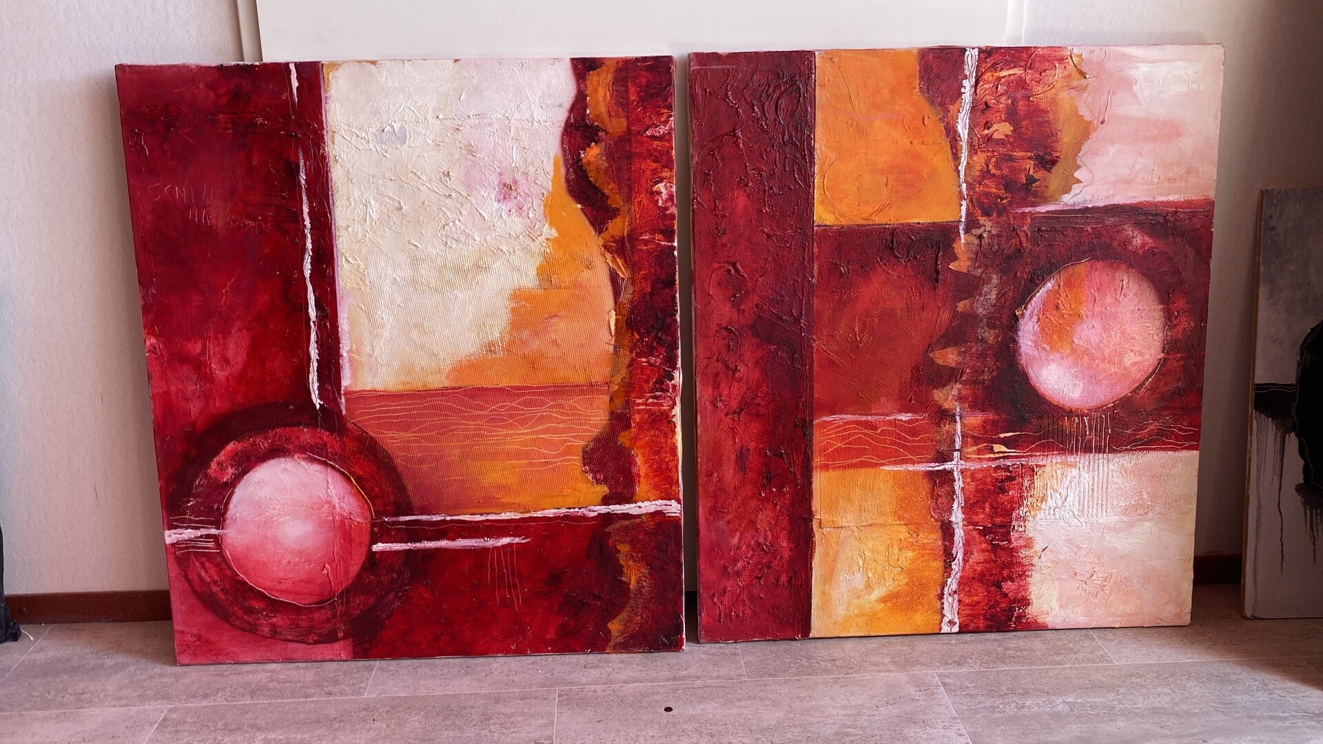 A2 formaat, tweeluik, vliesoline op jute, mixed media, inclusief lijst, €450